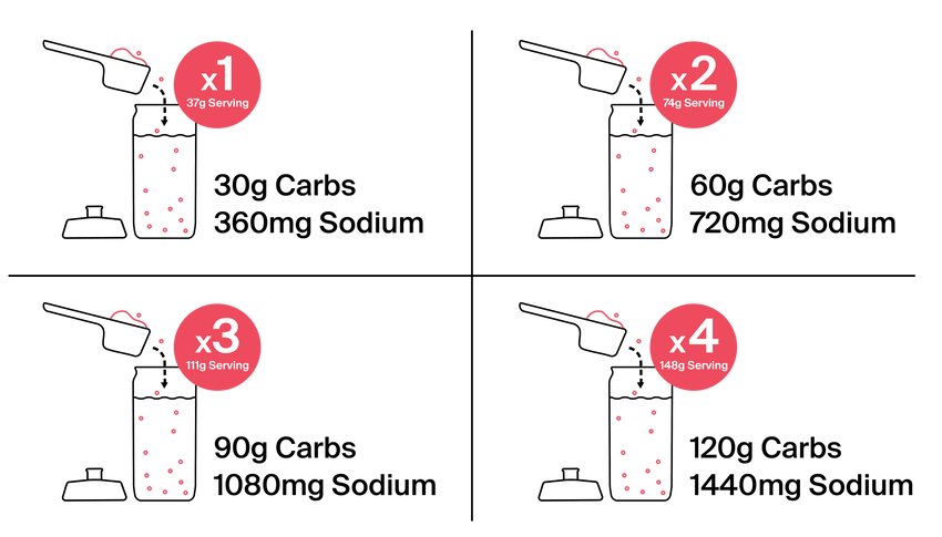 During intense activity, your body relies on carbohydrates for energy and electrolytes—particularly sodium—for hydration and sustained performance. Each serving provides 30g of carbohydrates and 360mg of sodium, with intake increasing based on duration and intensity.